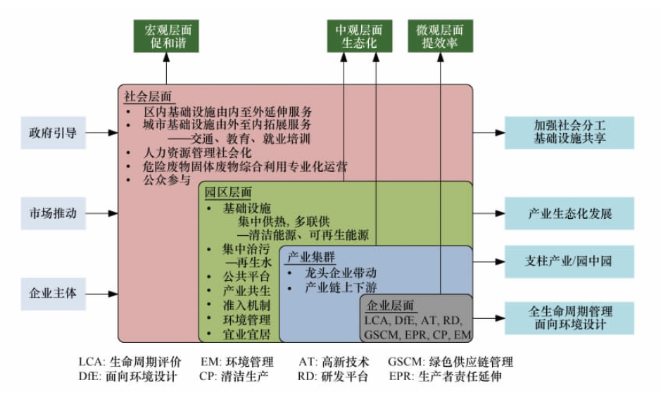 環(huán)保部組織出版了《中國(guó)生態(tài)工業(yè)園區(qū)建設(shè)模式與創(chuàng)新》,集中展現(xiàn)了多年以來(lái)國(guó)家生態(tài)工業(yè)示范園區(qū)的建設(shè)模式、特色與成效,總結(jié)梳理了一系列典型案例,并從6個(gè)方面凝練出現(xiàn)階段國(guó)家生態(tài)工業(yè)示范園區(qū)的主要建設(shè)模式,包括(1)企業(yè)層面以生態(tài)設(shè)計(jì)、綠色技術(shù)、節(jié)能降耗、環(huán)境管理為抓手推動(dòng)生態(tài)化發(fā)展;(2)基于物質(zhì)代謝、水資源高效利用、能量梯級(jí)利用及基礎(chǔ)設(shè)施共享推進(jìn)產(chǎn)業(yè)共生發(fā)展;(3)老工業(yè)基地向高新技術(shù)轉(zhuǎn)型、二三類產(chǎn)業(yè)協(xié)調(diào)融合發(fā)展,及傳統(tǒng)制造業(yè)向戰(zhàn)略性新型產(chǎn)業(yè)轉(zhuǎn)型促進(jìn)產(chǎn)業(yè)轉(zhuǎn)型升級(jí);(4)基于廢物循環(huán)利用的靜脈產(chǎn)業(yè)發(fā)展模式;(5)以流程工業(yè)為支柱且行業(yè)特征突出的園區(qū)集成創(chuàng)新實(shí)現(xiàn)資源能源高效利用;(6)在省會(huì)城市等大型城市布局的園區(qū)深化科技創(chuàng)新驅(qū)動(dòng)生態(tài)產(chǎn)業(yè)發(fā)展。