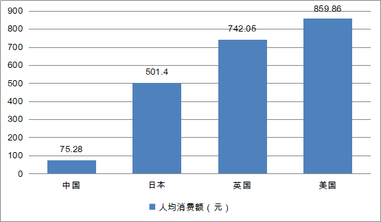 從消費(fèi)額來(lái)看,中國(guó)休閑食品人均消費(fèi)額為75.28元,而日本、英國(guó)、美國(guó)的該數(shù)額分別是501.4元,742.05元和859.86元,差距較大。