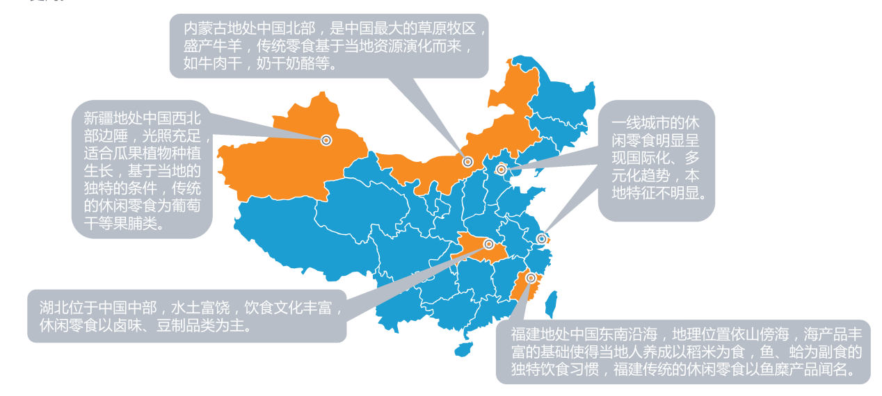 休閑食品的生產(chǎn)與農(nóng)業(yè)資源緊密相連。不同的地域有著截然不同的農(nóng)業(yè)資源,產(chǎn)業(yè)集中度較高,由此形成了眾多具備獨(dú)特資源優(yōu)勢(shì)的休閑食品品類,引領(lǐng)著中國(guó)休閑食品的發(fā)展潮流。目前,已經(jīng)興起了諸如福建軍團(tuán)、安徽炒貨軍團(tuán)、湖南辣食品、河南速凍食品軍團(tuán)等一大批優(yōu)秀的休閑食品企業(yè)。