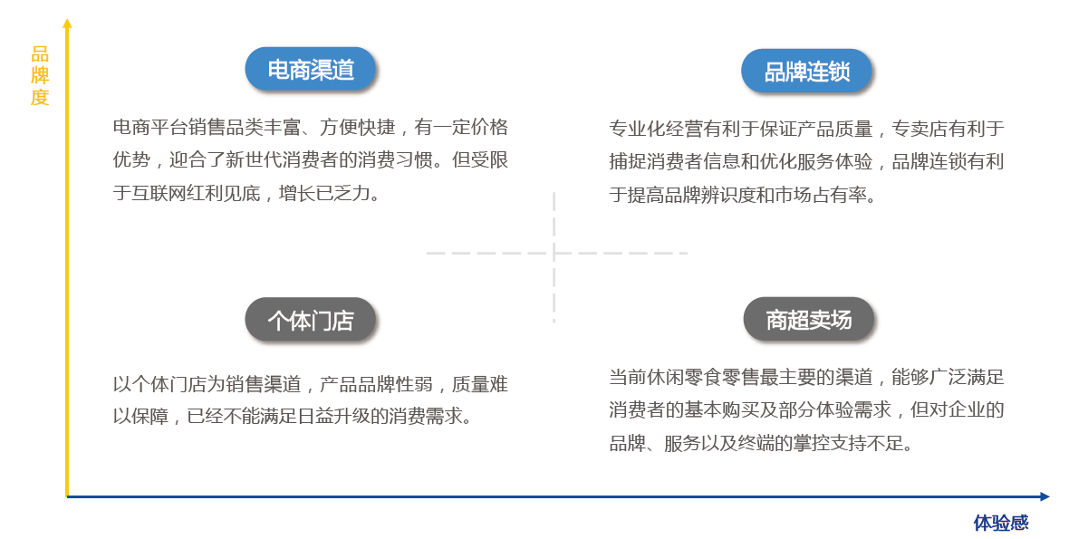 休閑零食的渠道陣營(yíng)主要有四大類:傳統(tǒng)的個(gè)體門(mén)店和商超賣(mài)場(chǎng),新興的品牌連鎖和電商渠道。在新零售浪潮的沖擊下,四大陣營(yíng)此消彼長(zhǎng),個(gè)體門(mén)店的市場(chǎng)份額不斷縮減,商超賣(mài)場(chǎng)的渠道影響力也將減弱,品牌連鎖和電商渠道將成為未來(lái)休閑零食新消費(fèi)的主流渠道。