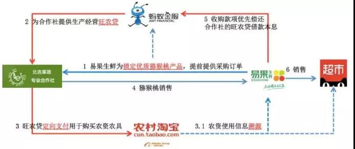 例如:天貓超市的供貨電商易果生鮮與陜西周至縣北吉果蔬專業(yè)合作社簽訂采購協(xié)議。螞蟻金服基于采購訂單,在對訂單進(jìn)行識別并確認(rèn)后,由網(wǎng)商銀行為合作社數(shù)百名果農(nóng)社員提供低息貸款,果農(nóng)拿到這筆貸款后,通過定向支付工具專項用于從農(nóng)村淘寶購買指定的農(nóng)藥、農(nóng)資、農(nóng)具。最后果品通過易果生鮮進(jìn)駐天貓超市進(jìn)行銷售。這種基于產(chǎn)業(yè)鏈形成的閉環(huán)信貸模式,突破了商業(yè)銀行傳統(tǒng)的評級授信要求,也無須另行提供抵押、質(zhì)押、擔(dān)保,提供的資金效率高、環(huán)節(jié)更簡單,利率則遠(yuǎn)低于民間借貸。