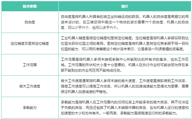工業(yè)機器人的主要技術(shù)參數(shù)一般有自由度、定位精度及重復(fù)定位精度、工作范圍、最大工作速度和承載能力等。這些參數(shù)是工業(yè)機器人本體制造過程中重要的考量指標,是衡量一家廠商本體制造水平高低的標準。