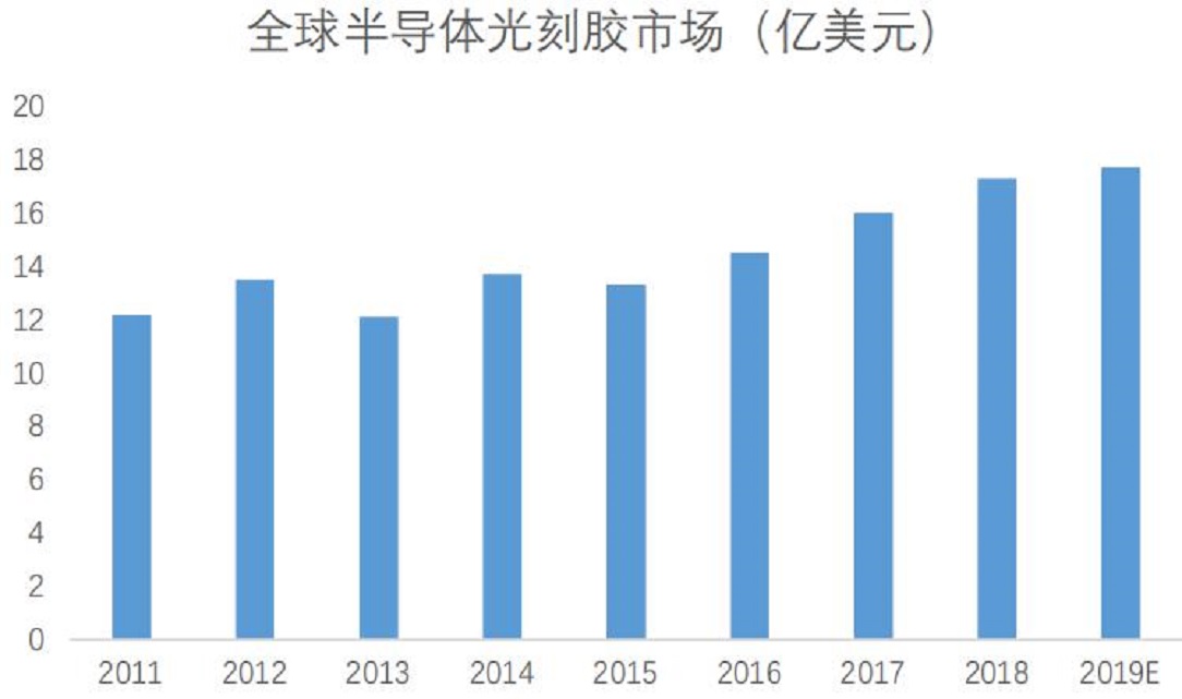 由于半導體光刻膠主要應用于半導體制造,故半導體光刻膠市場與對應晶圓廠產(chǎn)能密切相關(guān)。根據(jù)SEMI公布數(shù)據(jù),2018年全球半導體光刻膠市場共17.3億美元,同比增長2.3%。自2016年來,全球光刻膠市場年均復合增長率為9.23%。