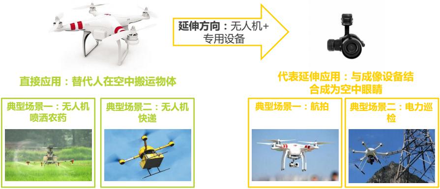 無人機價值在于替代人類完成空中作業(yè),并且能夠形成空中平臺,結(jié)合其他部件擴展應(yīng)用。