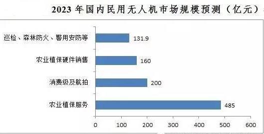 預計到2023年,我國民用無人機各細分應(yīng)用領(lǐng)域的市場份額分別為:消費級及航拍無人機市場200億元,農(nóng)業(yè)植保硬件銷售160億元,農(nóng)業(yè)植保服務(wù)485億元,巡檢、森林防火、警用安防等領(lǐng)域共計131.9億元,合計976.9億元。