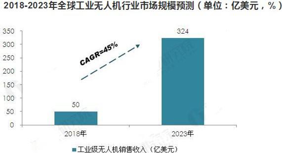 隨著工業(yè)級無人機技術(shù)的不斷發(fā)展,未來工業(yè)級無人機將呈爆發(fā)式增長。結(jié)合國際權(quán)威機構(gòu)對未來工業(yè)級無人機行業(yè)發(fā)展趨勢的判斷,預計到2023年,全球工業(yè)級無人機市場規(guī)模將超過300億美元。2018-2023年行業(yè)年均復合增長率將維持在45%左右。
