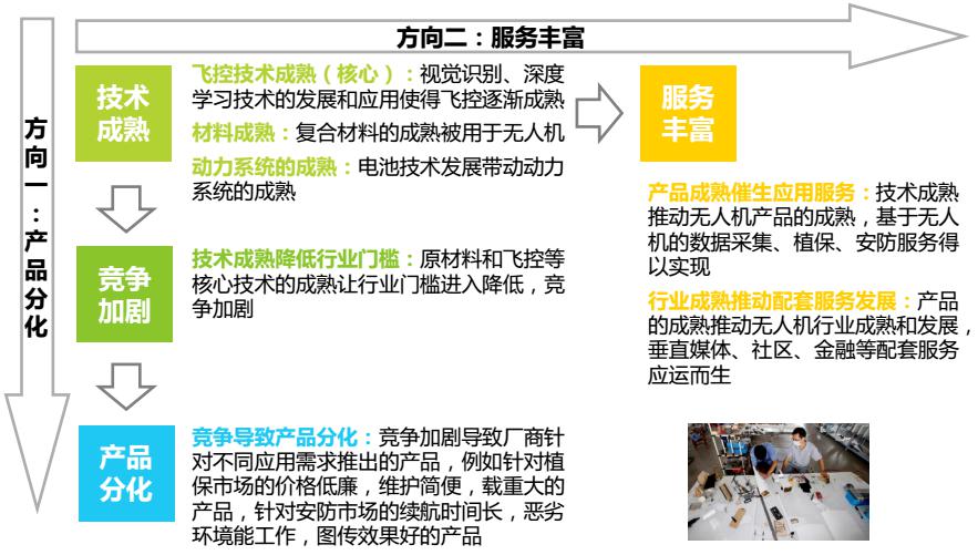 無人機技術(shù)成熟降低了行業(yè)門檻,使得行業(yè)競爭加劇,產(chǎn)品出現(xiàn)分化,技術(shù)和產(chǎn)品的成熟也使得應(yīng)用和配套服務(wù)越發(fā)豐富。