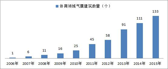 據(jù)《中國(guó)體育氣膜白皮書》統(tǒng)計(jì),截至2015年國(guó)內(nèi)體育用氣膜建筑面積已超過33萬平方米,全國(guó)氣膜體育場(chǎng)館數(shù)量?jī)H為133個(gè),被廣泛應(yīng)用于體育、商業(yè)娛樂、工業(yè)環(huán)保和物流四個(gè)氣膜建筑應(yīng)用領(lǐng)域中,體育占比最大為62%,主要為羽毛球、乒乓球、籃球、網(wǎng)球等體育場(chǎng)館。北京私立匯佳學(xué)校已經(jīng)建造了4個(gè)氣膜場(chǎng)館,分別是綜合運(yùn)動(dòng)館、籃球館、馬術(shù)館和游泳館,目前正在投入建設(shè)第五座氣膜場(chǎng)館—冰球館。