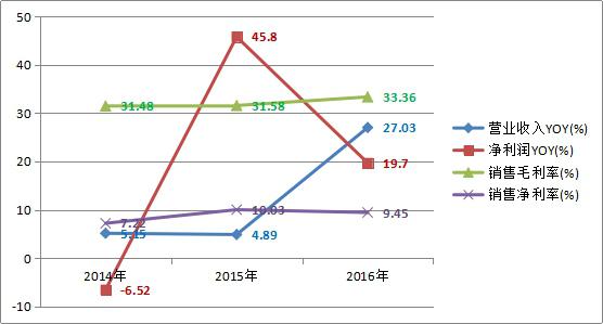 2016年,約頓的總資產(chǎn)增長(zhǎng)率、凈利潤(rùn)增長(zhǎng)率分別為69.61%、19.71%,兩指標(biāo)較2015年均有不同程度的下降;營(yíng)業(yè)收入增長(zhǎng)率為27.04%,較2015年有所上升。