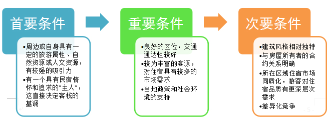 客棧民宿開發(fā)的條件主要可以分為以下三個(gè)層級,在開發(fā)過程中要注意這三類條件的層次,保證首要條件的情況下盡量滿足另外兩個(gè)層級的條件。