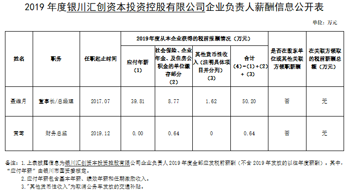 按照《銀川市屬國有企業(yè)負責(zé)人薪酬管理辦法(試行)》(銀國資發(fā)〔2021〕458號)規(guī)定,經(jīng)銀川市國資委核定,現(xiàn)將銀川匯創(chuàng)資本投資控股有限公司企業(yè)負責(zé)人2019年度薪酬信息予以披露。
